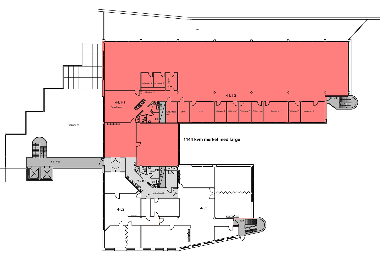 Kontorlokalene ligger i 4. etasje og er innredet med åpent kontorlandskap, cellekontorer og teamrom.